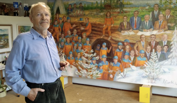 Henkilöhahmoja Kallaveden järvi- ja metsämaisemassa 1989, n. 10 m, triptyykki, Siilinjärven koulutuskeskuksen aula, Siilinjärvi